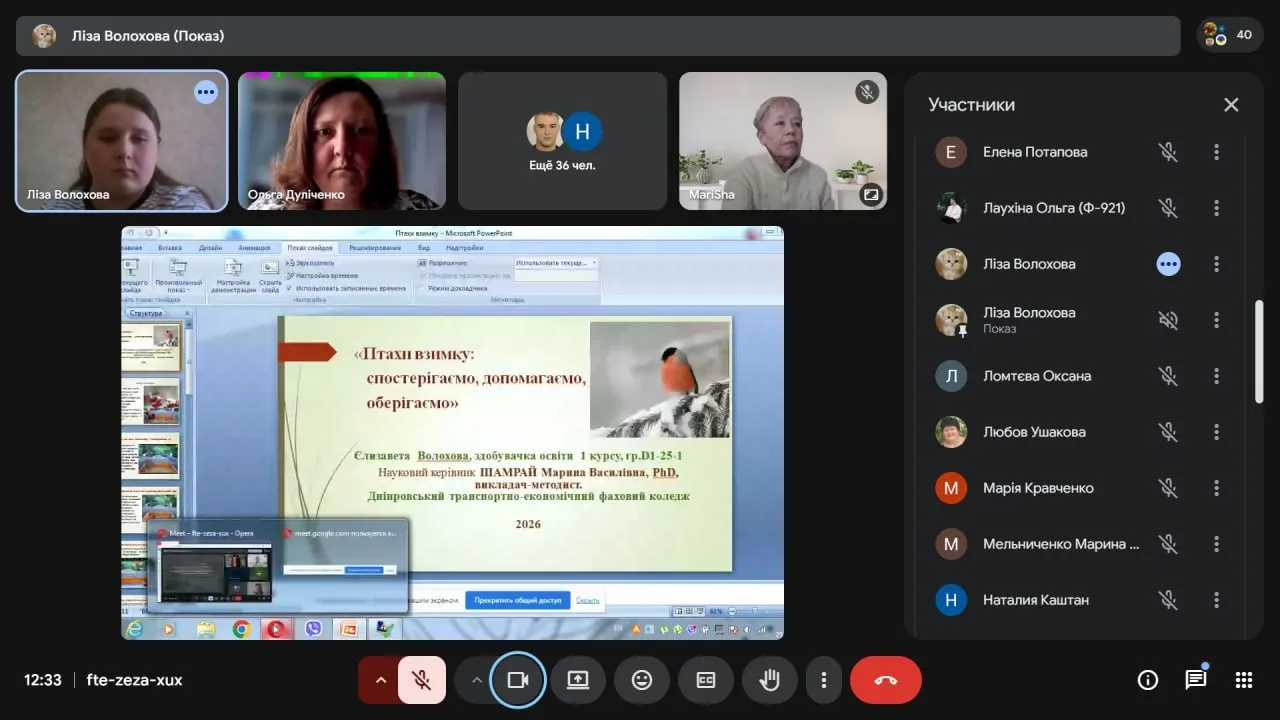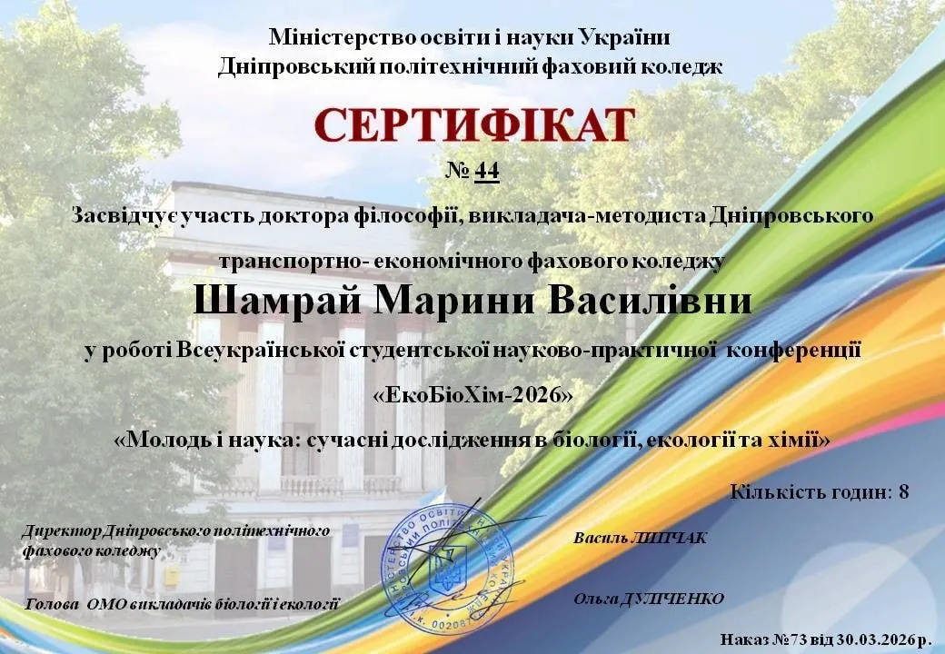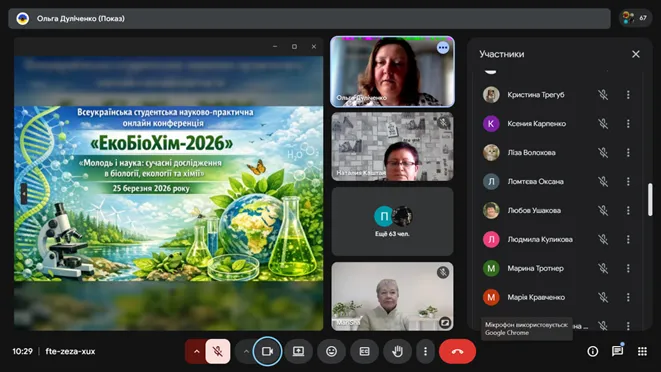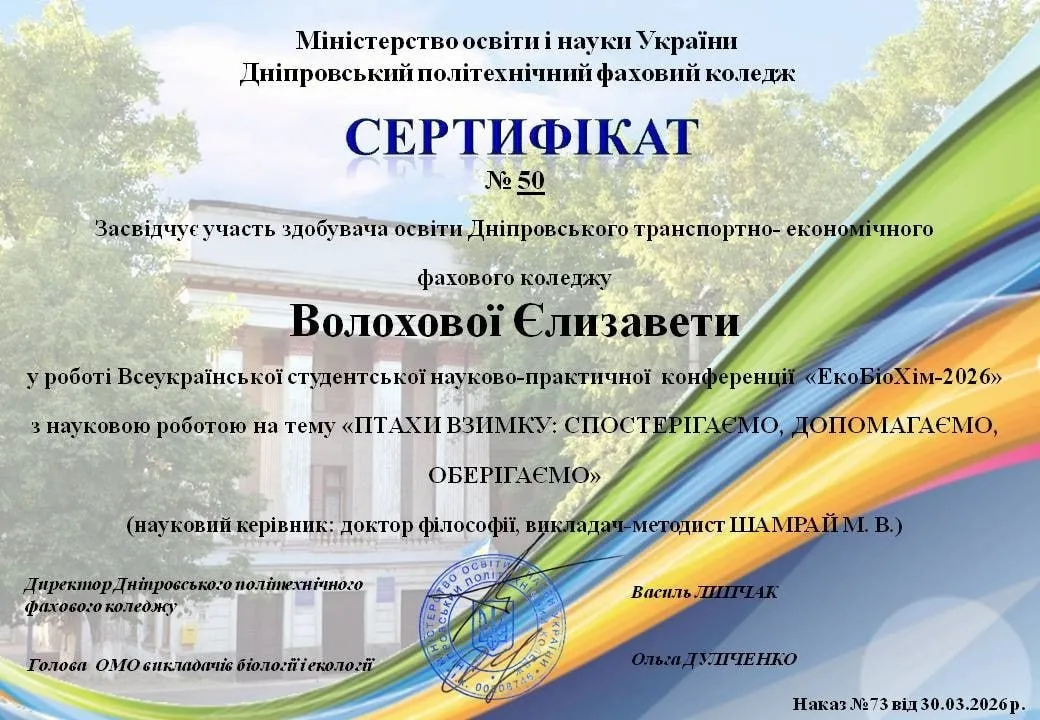 25 березня 2026, здобувачка освіти групи D1-25-1 Волохова Єлізавета, науковий керівник доктор філософії, викладач- методист коледжу Шамрай Марина Василівна, взяли участь у Всеукраїнській науково-практичній онлайн-конференції «ЕкоБіоХім-2026» на тему «Молодь і наука: сучасні дослідження в біології, екології та хімії».
